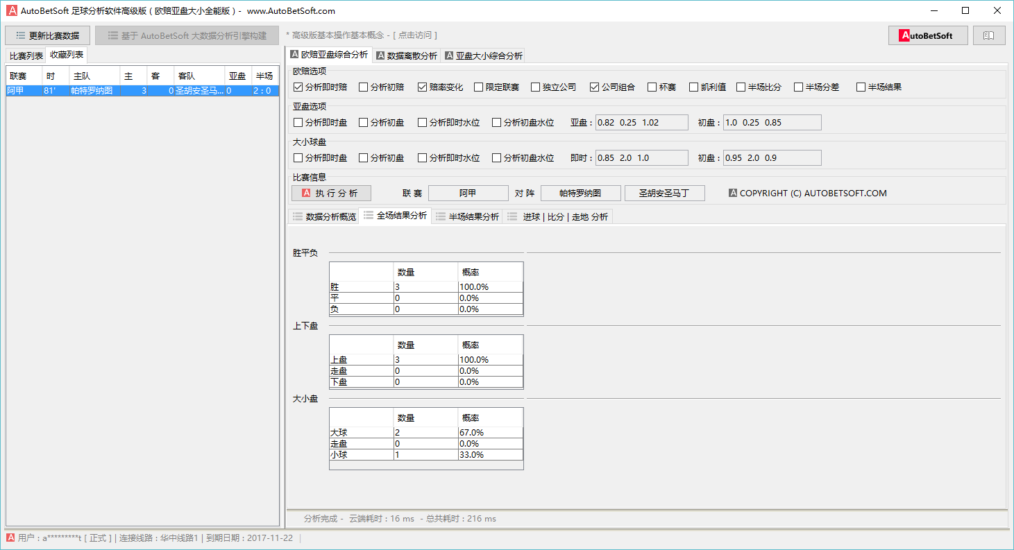 为保障用户利益,除公测期或特别指定测试版本,AutoBetSoft 足球分析软件、走地大球分析系统不提供任何试用。